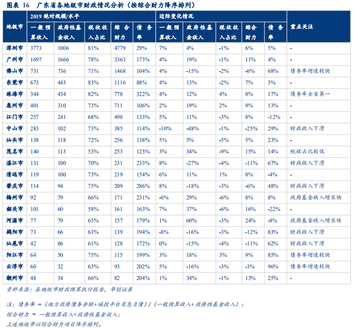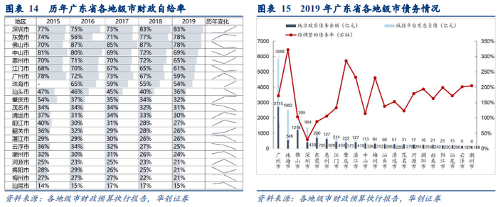 就广东省而言,深圳、广州的财政实力明显更强,珠三角各市财政自给率较高。2019年深圳、广州一般预算收入分别为3773亿元、1697亿元,其他各市均在1000亿以下,粤北财政实力较弱,多数地级市一般预算收入在100亿以下;政府性基金收入方面,广、深两城分别达到1666亿、1006亿,佛山市为736亿,居于全省第三,其他各市多在100-200亿左右,整体来看,广东省内其他城市与广州、深圳的综合财力差距显著,珠三角城市群实力好于粤西,而后者整体强于粤东和粤北。从税收收入占比看,广东省多数城市的税收收入占一般预算收入比重在70%以上,财政收入质量较高。