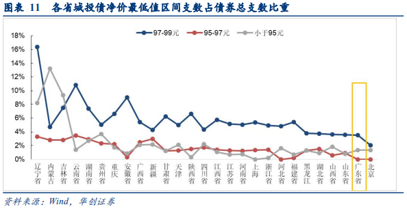 我们统计了2019年至今,各省存续城投债的净价波动情况。按存续城投债在2019-2020年期间达到的最低净价水平,我们划分了97-99元、95-97元及95元以下三个区间,统计各省城投债在这些区间的数量分布情况。从广东省城投债的净价波动情况看,最低净价分布在97-99元的城投债有16支,95-97元的有0支,低于95元的有6支,广东省全部存续城投债为451支,净价波动的个券数量较少,估值表现稳定。