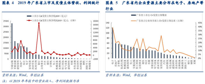 从省内上市及发债主体情况来看,截至2020年6月,广东省内上市公司数量达到684家,占全部上市公司数量的16%,在所有省份中位居第一,行业方面集中在电子、计算机、机械设备等;非上市的产业债发行主体共254家,居全国第三,存续产业债规模达11681.4亿元,其中综合、房地产、非银金融等行业产业债发行最为活跃,省存续规模占各行业全部存续规模比重分别达到20%、34%、9%。结合行业经济贡献来看,2019年全省化工、建筑装饰、采掘、银行等行业合计营收规模较高;银行、房地产、非银金融等行业合计净利润规模较大,对地区税收及经济增长的贡献度较高。