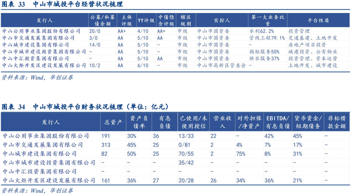 中山位于广东省中南部,是珠三角中心城市之一。区划方面,中山市总面积近1800平方公里,下辖18个镇(黄圃镇、南头镇等),6个街道(石岐街道、东区街道、西区街道、南区街道、五桂山街道、火炬开发区街道),2019年末全市常住总人口338万人。产业方面,装备制造业是中山的第一大支柱产业,传统产业如家电、灯饰、五金、食品等正处于改造转型期,与此同时,中山市的高端装备制造、新一代信息技术、健康医药三大战略性新兴产业快速发展,知名企业包括大洋电机、乐百氏等。平台方面,全市共有6家市级城投平台,主要业务包括投资管理、土地开发等。