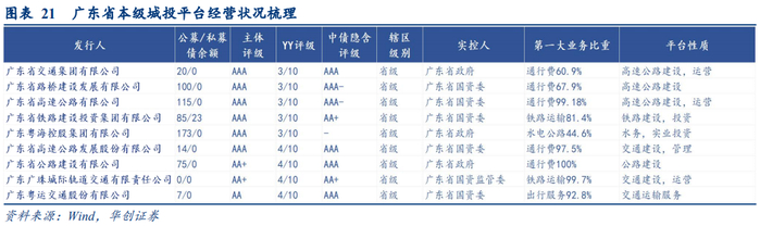 广东省共有9家省级城投平台,其中6家主体评级为AAA,2家主体评级为AA+,1家评级为AA;6家省级城投平台均受广东省政府、国资委或监管委实际控制,平台主要业务涉及公路建设、交通建设等领域。