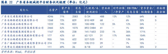 财务状况方面,广东省交通集团有限公司资产总额达到4246亿元,是广东省内规模最大的城投平台,但同时其资产负债率偏高(71%),有息负债存量大,授信额度相对不足,或较为依赖债务滚续融资。此外,资产规模超过千亿的城投平台还包括:广东省路桥建设发展有限公司、广东省高速公路有限公司、广东省铁路建设投资集团有限公司、广东粤海控股集团有限公司。其中,广东铁建和粤海控股资产负债率较低,可用授信额度较高,信用资质较好。