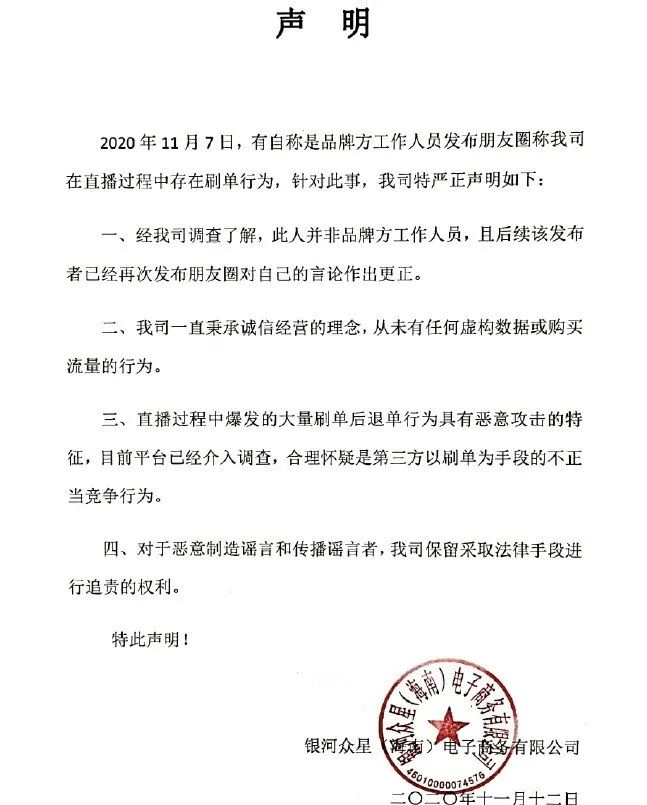 对此,这场直播的承办方银河众星电子商务回应称,直播过程中爆发的大量刷单后退单行为具有恶意攻击的特征,合理怀疑是第三方以刷单为手段的不正当竞争行为。