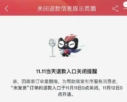 在今年11月11日当天,天猫平台将退款入口暂时关闭,平台解释为:因商家订单量剧增,为帮助商家有序服务消费者,“未发货”订单的退款入口于11月11日0点关闭,11月12日0点开通。