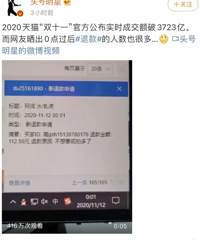 对于平台来说,数据的统计已经结束,但是对于商家而言,另一场赛跑正在开始。11日刚过,#退款#的话题便登上微博热搜话题榜,其中有一位网友更是晒出某位商家后台的退款订单视频。视频显示12日0:01分,这位商家后台便堆积了165条退款申请信息,在5秒钟的视频中,充斥着密集的退款订单提示音,退款订单数量也飞速上涨。