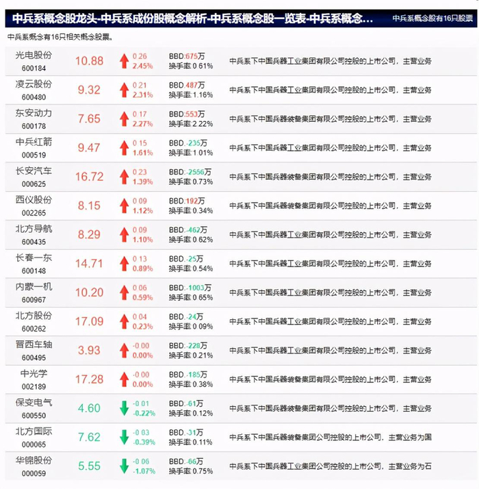 中兵系旗下有15家A股上市公司,其中比较指明的有:北方导航、中兵红箭,其余大多数从公司名称中难以直观的判断出来,比如长安汽车、东安动力、长春一东都是汽车零部件公司。他们的军工属性相对弱一些。