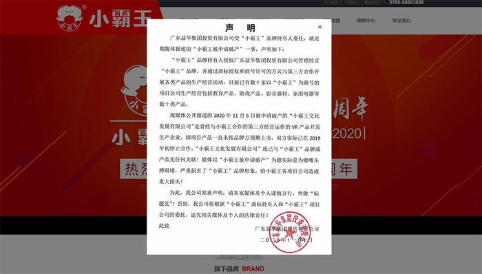 据报道,小霸王文化发展有限公司被申请破产重整,申请人为殷小云。但事实上,这只是一个乌龙,不久后,受 “小霸王”品牌持有人委托,广东益华集团投资有限公司在小霸王官网上发表声明称,近期 “小霸王被申请破产”的小霸王实际上是小霸王文化发展有限公司,系曾与小霸王合作的第三方经营运作 VR 产品开发方,现与 “小霸王”品牌或产品无任何关联。