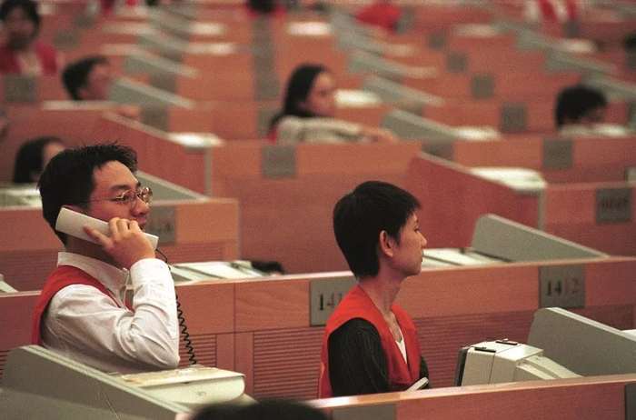 2000年10月30日,上海证券交易所里的打电话的“红马甲”交易员。图/视觉中国