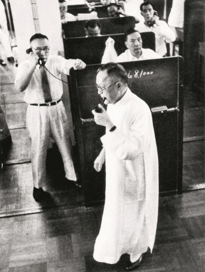 1955年7月3日,香港证券交易所内,繁忙的生意人或通过电话、或相互攀谈,随时关注股市变化。图/FOTOE