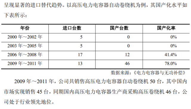 先导智能招股书显示,2009年至2011年,先导智能共销售高压电力电容器自动卷绕机50台,其中国内市场45台,同期国内高压电力电容器生产商采购高压卷绕机45台。