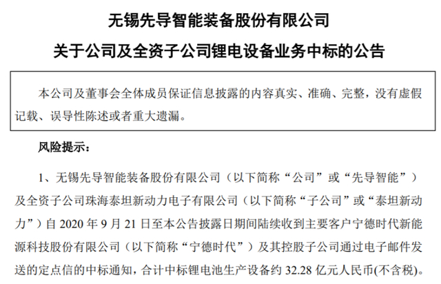 11月10日,先导智能公布了最近50天取得的成绩:公司及全资子公司泰坦新动力自9 月21日至11月10日,收到宁德时代及其控股子公司中标通知累计32.28 亿元(不含税,约占公司2019年经审计营业收入总额的68.92%)。