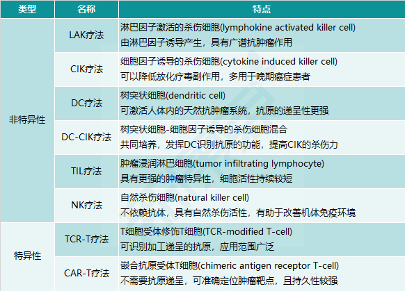 细胞免疫疗法经历了较长的发展历程,早在1982年,美国医生Grimm等在外周血单核细胞中,加入IL-2体外培养,诱导出LAK(淋巴因子激活杀伤细胞),可以杀伤对CTL(细胞毒性T淋巴细胞)、NK(自然杀伤细胞)不敏感的癌细胞。此后,TIL(肿瘤浸润淋巴细胞)、CIK(细胞因子诱导杀伤细胞)、CAR-T(抗原嵌合受体T细胞)被陆续发现。目前,细胞免疫疗法可分为非特异性和特异性两大类(图表3)。