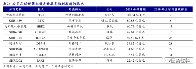 公司已上市、在研创新药囊括了PD-1/L1、HER2、JAK、IL-17A等多个市场潜力大的靶点,其中多个同靶点已上市药物销售额超过30亿美元以上(如PD-1、CDK4/6、IL-17A等),显示出公司在创新药立项具有独到超前的战略眼光。