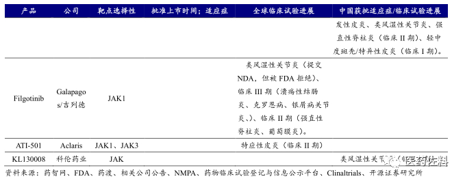 目前全球范围内已有Tofacitinib、 Ruxolitinib等7种JAK抑制剂上市。第一代JAK抑制剂如Tofacitinib等会对多种JAK都产生抑制效果,但由于JAK家族介导多种细胞因子的信号传导,全面抑制JAK家族也会带来多种副作用,包括感染、贫血、中性粒细胞减少症、淋巴细胞减少症、和高脂血症等,例如Tofacitinib就被FDA给予黑框警告,提示有感染、肺结核、深静脉血栓等不良反应风险,因此开发选择性更高的JAK抑制剂成为了新的方向。目前已有Upadacitinib和Fedratinib两个选择性JAK抑制剂上市,多个品种处在不同研发阶段。