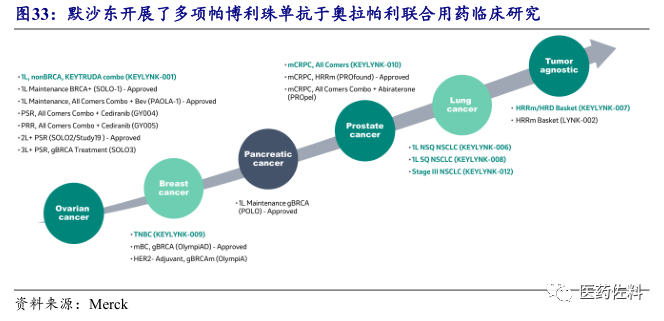 默沙东开展了多项帕博利珠单抗联合奥拉帕利治疗多个癌肿的临床研究(KEYLYNK系列研究)。适应症除了卵巢癌外,还包括三阴乳腺癌、前列腺癌和非小细胞肺癌等。显示出PARP抑制剂在联合用药方面具有较大潜力可供发掘。
