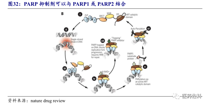 PARP抑制剂通过与PARP1或PARP2催化位点的结合,导致PARP蛋白无法从DNA损伤位点上脱落,导致DNA的复制无法正常进行,此时细胞通常会激发称为同源重复修复(Homologous Recombination Repair,HRR)的其他DNA修复方法。BRCA1、BRCA2和其它称为“类BRCA” 的蛋白在修复细胞DNA损伤中起到关键作用,当肿瘤细胞的这些蛋白功能受损导致HRR功能失常时,细胞运用的其它DNA修复方法通常会引入大规模的基因组重组,从而导致细胞死亡。在携带BRCA基因突变的肿瘤细胞中,BRCA介导的DNA损伤修复通路已经受到破坏,再使用PARP抑制剂来抑制PARP在DNA修复中的功能,将导致细胞由于过多DNA损伤无法修复而死亡。而健康细胞因为BRCA介导的DNA修复通路没有受到损伤,不会因为PARP抑制而死亡。
