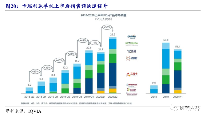 公司的卡瑞利珠单抗于2019年5月以治疗难治性霍奇金淋巴瘤获批上市,随后销售额快速增长,2020年卡瑞利珠单抗用于既往接受过索拉非尼治疗和/或含奥沙利铂系统化疗的晚期肝细胞癌患者的治疗;联合培美曲塞和卡铂适用于表皮生长因子受体(EGFR)基因突变阴性和间变性淋巴瘤激酶(ALK)阴性的、不可手术切除的局部晚期或转移性非鳞状非小细胞肺癌(NSCLC)的一线治疗;用于既往接受过一线化疗后疾病进展或不可耐受的局部晚期或转移性食管鳞癌患者的治疗3个新适应症相继获批,目前获批适应症数量为4个,仅次于帕博利珠单抗。
