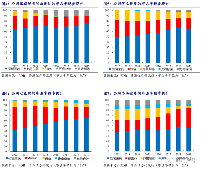 在仿制药时代,公司多个核心品种如多西他赛、苯磺酸顺阿曲库铵、伊立替康和七氟烷等市占率稳步提升,体现出公司具有较强的销售推广能力。