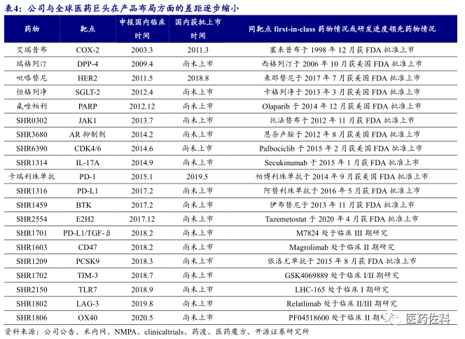 公司首个创新药艾瑞昔布于2003年申报临床, 2011年3月上市,同靶点first-in-class药物塞来昔布已经于1998年底获得美国FDA批准上市,申报临床落后约4年时间,上市落后约10年时间。随着公司研发实力的增强,创新药项目研发进度与first-in-class药物的时间差距逐渐缩小,例如卡瑞利珠单抗于2019年5月获批上市,同靶点药物帕博利珠单抗于2014年9月获美国FDA批准上市,上市时间仅落后不到4年时间;吡咯替尼于2018年8月获批上市,同靶点药物来那替尼于2017年7月获得美国FDA批准上市,仅落后约1年时间。目前公司临床早期管线中的产品与全球同靶点药物研发进度基本同步,体现出公司fast-follow的研发策略效率逐步提升,与全球医药巨头在产品布局方面的差距逐步缩小。