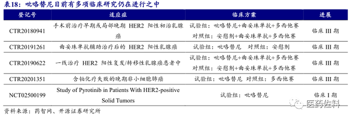 目前吡咯替尼还有多项临床研究正在进行之中,包括手术前治疗早期或局部晚期 HER2 阳性初治乳腺癌(新辅助治疗)、一线治疗 HER2 阳性复发/转移性乳腺癌和曲妥珠单抗辅助治疗后的 HER2 阳性乳腺癌(序贯治疗)。若相应临床试验能够取得正面结果,吡咯替尼所覆盖患者群体将从晚期/转移性HER2+乳腺癌扩大到全部HER2+乳腺癌患者并进入一线疗法,成为乳腺癌治疗全流程用药。除了乳腺癌外,吡咯替尼也在积极探索如HER2+非小细胞肺癌等新病种,针对HER2+实体瘤的临床I期研究已经在美国开始。