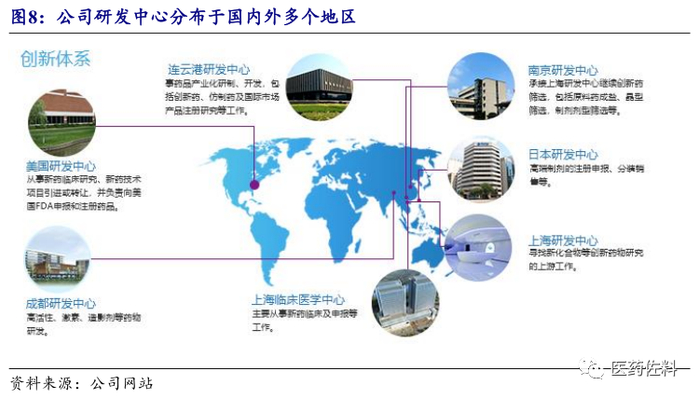 公司在中国、美国和日本等建立了覆盖药物研发全流程的创新体系。国内拥有连云港(药物产业化研制/开发)、上海(新化合物寻找)、南京(创新药筛选)和成都(造影剂等药物研发)、上海临床医学中心(新药临床和申报)等机构,美国研发中心主要从事新药临床研究、项目引进/转让和FDA申报注册等工作,日本研发中心主要从事高端制剂申报注册,分销等工作。