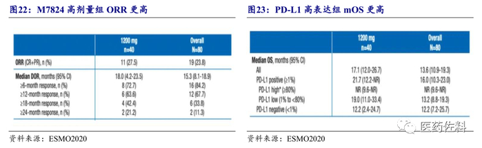 M7824在临床研究也展示出了较好的疗效,德国默克在2020年ESMO上披露了M7824二线治疗非小细胞肺癌/胆管癌的临床数据。在二线治疗非小细胞肺癌3年随访研究表明,ORR为23.8%,67.7%的患者疗效持续超过1年,其中1200mg高剂量组受益更为明显。该临床研究中患者总体中位生存期为13.6个月,1200mg高剂量组总体中位生存期为17.1个月,高于平均值,与PD-L1表达阴性者相比,PD-L1表达阳性(≥1%)的群体获益更显著,而PD-L1高表达(≥80%)患者的获益可能更加明显,体现为中位生存期依次增加。