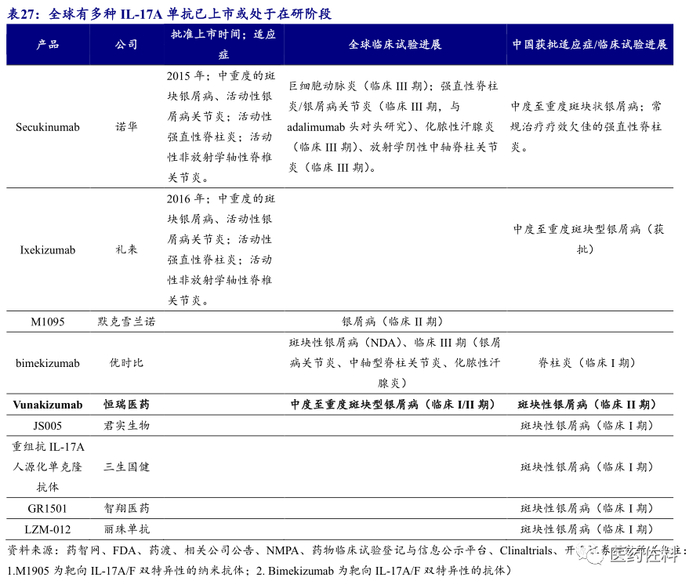 目前Secukinumab仍在进行适应症拓展,巨细胞动脉炎等适应症的临床研究已经进入临床III期。目前还有多个靶向IL-17A单抗和靶向IL-17A/F的双抗处于不同临床研究阶段,恒瑞医药的Vunakizumab(SHR-1314)是进展最快的国产IL-17A单抗,正同步在中国和美国开展临床II期研究,有望成为第3个在国内上市的IL-17A单抗。