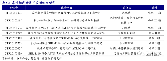 公司一方面开展了针对晚期卵巢癌一线维持治疗、复发性卵巢癌、乳腺癌等新适应症等临床研究,另一方面发挥自身管线丰富的优势,氟唑帕利与阿帕替尼、SHR-PD-L1单抗SHR-1316和卡瑞利珠单抗等的联合用药。我们认为凭借着公司丰富的肿瘤药产品线,氟唑帕利的适应症仍将持续扩展。