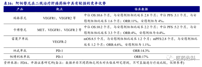 多个PD1/LI单抗(如帕博利珠单抗+仑伐替尼、阿替利珠+贝伐珠单抗)在积极探索一线治疗肝细胞癌并取得了积极成效,显示出PD-1/L1单抗+抗血管生成靶向药物在肝细胞癌领域潜力巨大。目前阿帕替尼联合卡瑞利珠单抗一线治疗肝细胞癌的国际多中心 III 期临床试验在美国、欧洲和中国同步开展。FDA 同意即将开展的Ⅲ期临床试验并在无进展生存期期中分析结果达到预设的统计学标准时提前申报生产,这意味着本次申请如果最终通过,将获得加速审评资格。