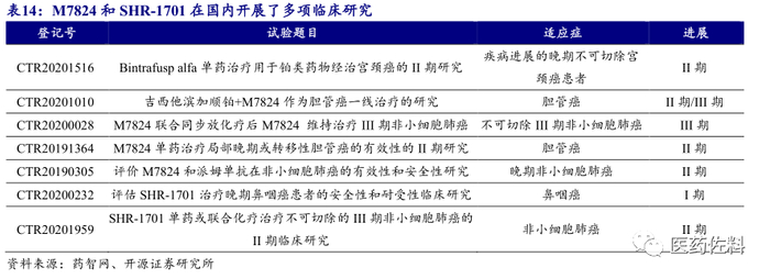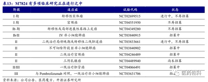 目前M7824有多项临床研究正在进展之中,其中最引人瞩目的是与帕博利珠单抗头对头,一线治疗PD-L1高表达非小细胞肺癌的临床研究。该临床研究若取得正面结果,将大大提升其在肿瘤免疫治疗领域的地位。