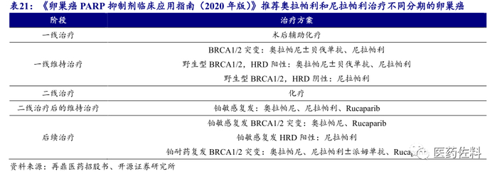 70%的卵巢癌患者首次诊断时处于晚期,在接受手术、铂类药物化疗后可得到缓解,但在接受一线疗法后达到完全缓解的上皮性卵巢癌患者中大约有85%会复发,复发患者的治疗手段有限且复发间隔期于每次复发后会变短。PARP抑制剂的获批极大的改变了以往卵巢癌治疗的标准疗法,目前中华医学会妇科肿瘤学分会组织编写的《卵巢癌PARP抑制剂临床应用指南(2020年版)》已经将奥拉帕利和尼拉帕利推荐用于不同阶段卵巢癌的治疗。