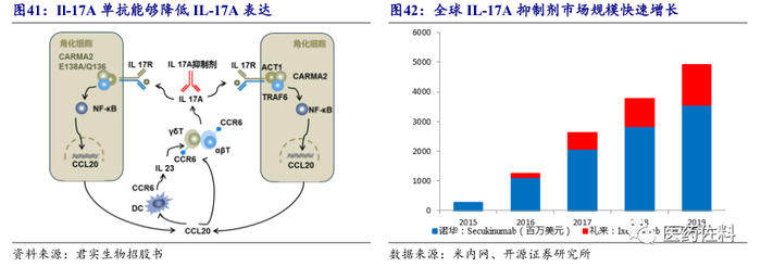 IL-17A 是一种具有多效性的细胞因子,可以作用于多种细胞,增强炎性分子的表达,在机体抗胞外菌和真菌感染中发挥关键作用;IL-17A 的异常表达也与多种自身免疫疾病和肿瘤的发生发展有关。IL-17A 分泌的增加是由于突变引发皮肤角化细胞中 NF-κB 信号的激活,促进CCL20 (趋化生长因子 20)等分子的表达,引起 αβT 细胞等的浸润和激活,促进细胞因子 IL-17A 的分泌,进而进一步刺激角化细胞的激活,上调 CCL20 等的表达,从而形成炎症循环,诱发银屑病发生。抗 IL-17A 单抗可以与 IL-17A 结合,降低 IL-17A 的表达,起到抑制炎症反应的作用。目前FDA已经批准诺华的Secukinumab和礼来的Ixekizumab两个IL-17A单抗上市,2019年销售额分别为35.51亿美元(+25%)和13.66亿美元(+46%),处于快速增长阶段。