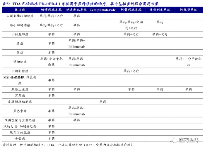 目前FDA已经批准6种PD-1/PD-L1单抗上市,其中帕博利珠单抗、纳武利尤单抗和 Cemiplimab-rwlc为PD-1单抗,阿替利珠单抗、度伐利尤单抗和阿维努单抗为PD-L1单抗,PD-1/PD-L1单抗已经获批用于十余个适应症的治疗,疗法包括单药、单药+化疗、单药+靶向药等多种联合用药方案。