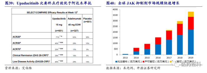 JAK抑制剂在自身免疫疾病方面有较大的潜力。以Upadacitinib为例,在治疗中度至重度类风湿性关节炎成人患者的SELECT-COMPARE临床III期研究结果显示,upadacitinib具有比安慰剂更好的ACR20疗效(71% vs 36%),且在一系列次要终点上疗效优于阿达木单抗(ACR50:45%vs 29%;ARC70:25% vs 13%;临床缓解率:29%vs 18%)。JAK抑制剂均是小分子药物,主要以口服为主,与生物制剂相比在给药便捷性和患者依从性方面具有一定优势,预计未来将在自身免疫疾病治疗中占据重要地位。