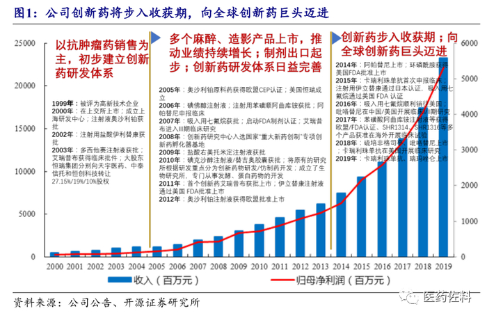 恒瑞医药成立于1970年,2000年上交所上市,自上市至2019年公司营业收入从4.85亿元增长到232.89亿元,年复合增速为24.00%,归母净利润从0.65亿元增长到53.28亿元,年复合增速为27.70%。公司早期销售抗肿瘤药为主,并初步起建立创新药研发体系。2006年起公司多个抗肿瘤药、麻醉药物、造影药物陆续上市,推动业绩持续增长,同时制剂出口开始起步,创新药研发体系日益完善。2011年公司首个创新药艾瑞昔布上市,阿帕替尼与2014年上市,2018年至今已有硫培非格司亭、吡咯替尼、卡瑞利珠单抗和甲苯磺酸瑞马唑仑等多个创新药上市,公司创新药步入收获期。