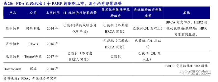 目前美国FDA已经批准了奥拉帕利(Olaparib)、芦卡帕利(Rucaparib)、尼拉帕利(Niraparib)和Talazoparib4种PARP抑制剂上市,其中奥拉帕利和尼拉帕利已经国内上市。FDA批准的PARP抑制剂适应症包括卵巢癌的一线/后线维持治疗,复发性卵巢癌的治疗、BRCA突变阳性乳腺癌、胰腺癌等。