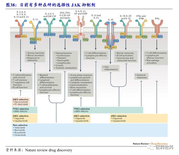 JAK(Janus Kinase),属于非受体型蛋白酪氨酸激酶家族,包括 JAK1、JAK2、JAK3、Tyk2 四个成员,可以介导细胞因子产生的信号,并通过 JAK/STAT 信号通路传递。JAK/STAT 途径激活在免疫系统的调控、促进细胞生长、抗凋亡及促进细胞周期方面发挥重要的作用;与肿瘤的发生发展也有着密切的关系,对造血细胞的生长发育也有着重要的调控作用。JAK1、JAK3和TYK2多与自身免疫性疾病相关,而JAK2对于驱动干细胞变成红血球和血小板有重要作用。目前JAK1、JAK3已经成为自身免疫性疾病、炎症等疾病的新型靶点,适应症包括类风湿性关节炎、强直性脊柱炎等;JAK2已经成为血液系统疾病的新型靶点,适应症包括骨髓纤维化等。