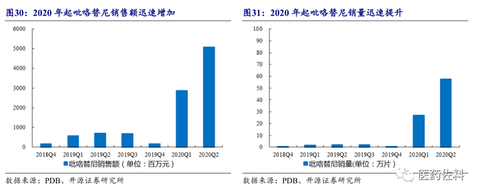 吡咯替尼于2019年通过谈判纳入了全国医保目录,医保支付价为160mg×28/瓶:4093.6元;80mg×14/瓶:1204元,与谈判前相比下降约60%,年费用为9.5万元左右。进入医保患者经济负担大幅降低,2020年起吡咯替尼销售量和销售额迅速提升。