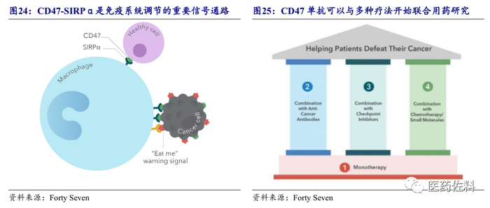 当CD47与巨噬细胞上的SIRP-alpha受体结合时,它发出“不要吃我”的信号,从而抑制巨噬细胞的破坏;此外还能够阻断巨噬细胞通过内源性的“吃我”信号(如钙蛋白酶)和表面表达抗原的抗体识别癌细胞。因此CD47单抗可以通过阻断癌症细胞的CD47信号,巨噬细胞就能够在吞噬癌细胞的过程中会产生肿瘤特异性抗原,激活T细胞对抗癌症,并产生长期的抗肿瘤免疫作用。除了单药疗法外,CD47单抗与其他单抗、PD-1/L1单抗和小分子靶向药的联用也在拓展之中。