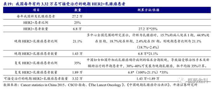 目前我国每年新发乳腺癌患者数量为27.2万,其中HER2+患者比例约为25%,数量6.8万人,我们测算每年新发乳腺癌患者中可接受治疗的晚期HER2+乳腺癌患者数量为3.32万人,按每位患者治疗费用10万元/年,患者数量保守按照3.32万人计算,市场空间可达33.2亿元,我们认为吡咯替尼凭借优异的临床疗效有望取得较高的市场份额,若未来乳腺癌新辅助治疗、乳腺癌序贯治疗和非小细胞肺癌等新适应获批,吡咯替尼销售峰值仍有提升空间。