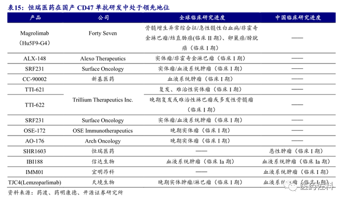 目前全球进展最快的CD47单抗为Forty Seven公司(现已经被吉利得科学收购)的Magrolimab,Magrolimab+Azacitidine在治疗骨髓增生异常综合症( MDS)和急性髓系白血病(AML)的1b期试验结果显示,在MDS患者亚组中,患者的总缓解率(ORR)达到92%,其中50%的患者达到完全缓解(CR),在AML患者亚组中,患者的ORR达到64%,其中41%的患者达到CR,显著优于Azacitidine单药。Magrolimab+利妥昔单抗治疗非霍奇金淋巴瘤Magrolimab+西妥昔单抗治疗结直肠癌、 Magrolimab+Avelumab/Atezolizumab治疗卵巢癌/膀胱癌的临床研究也进入不同临床阶段,CD47单抗未来在实体瘤治疗领域的应用值得期待。恒瑞医药的SHR1603已经开始临床I期研究,是国内进展最快的CD47单抗之一。