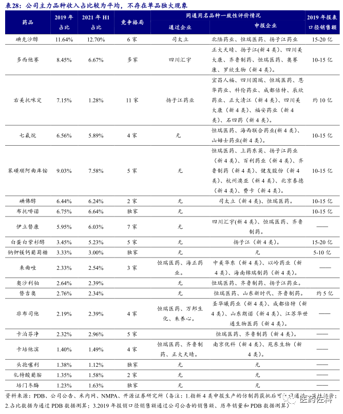 公司仿制药收入体量虽然较大,但品种数量较多,以2019年报表口径收入进行测算,占比较大的碘克沙醇、多西他赛、右美托咪定等品种收入占比均仅在5%左右,多数品种样本医院销售额占比在10%以内,公司主力产品收入占比较为平均,不存在单品独大的现象。