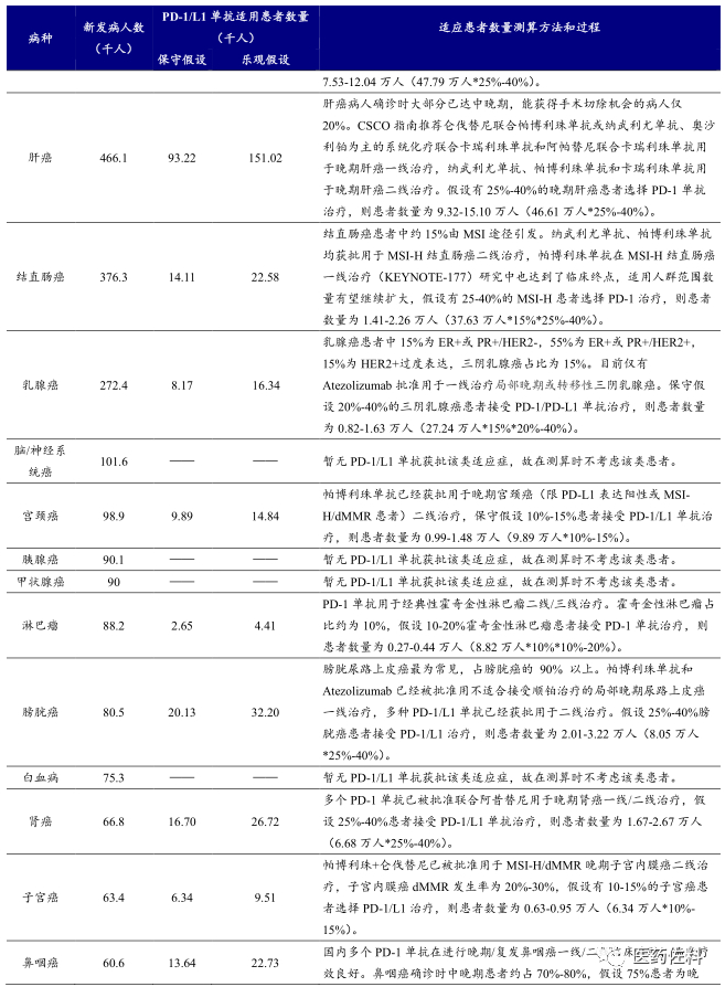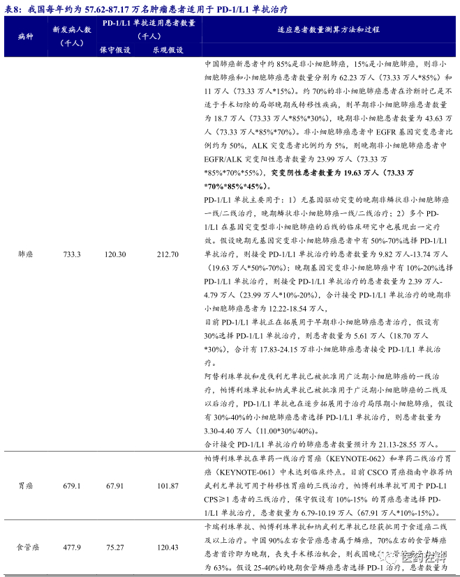 我们根据PD-1/L1单抗适应症获批、临床研究进展和中国肿瘤流行病学数据对国内PD-1/L1单抗适用患者数量进行了测算,预计我国每年约有57.62-87.17万名肿瘤患者适用于PD-1/L1治疗,其中肺癌、肝癌、食道癌和胃癌4大适应症患者占比合计超过75%,PD-1/L1单抗在上述适应症中的临床研究结果、进度等将对其市场份额起到决定性作用。