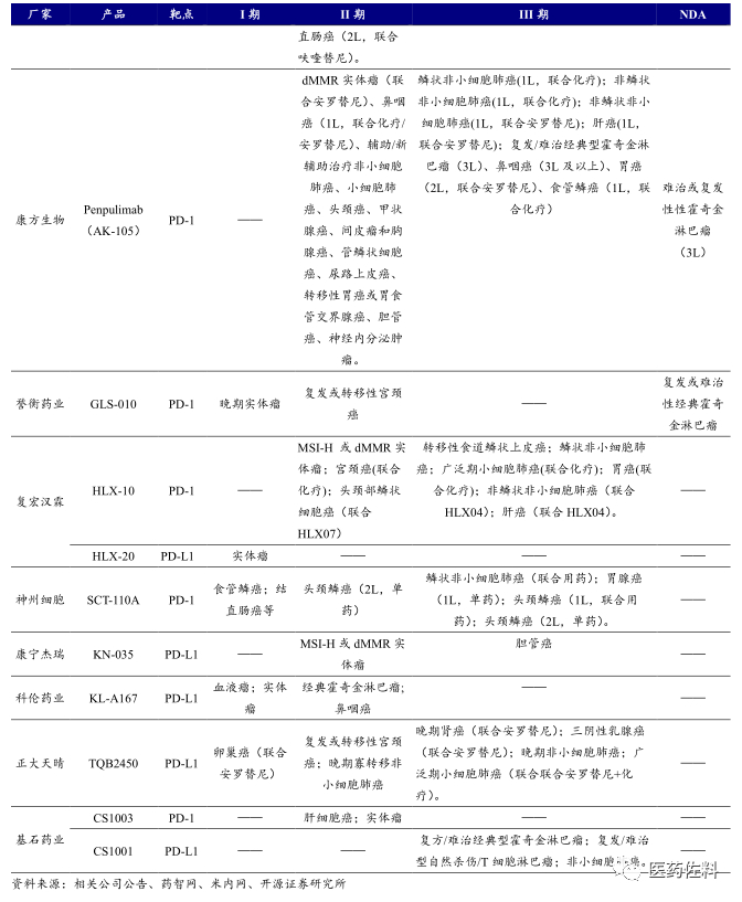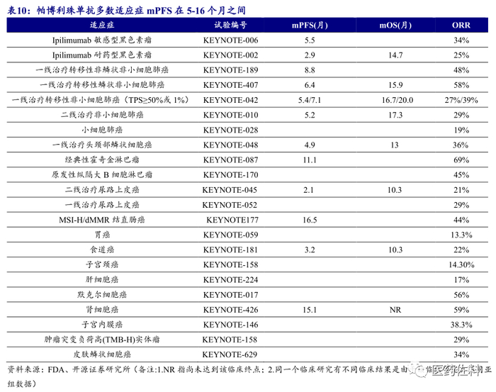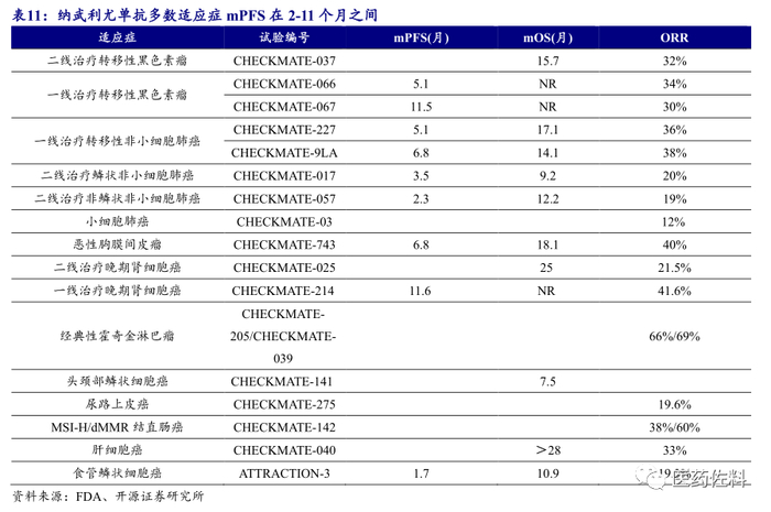 从已披露的帕博利珠单抗和纳武利尤单抗临床试验数据来看,帕博利珠单抗多数适应症mPFS(中位无进展生存期)在5-16个月之间,其中销售占比最大的肺癌适应症4组临床mPFS分别为8.8、6.4、7.1和5.2个月,纳武利尤单抗多数适应症mPFS(中位无进展生存期)在2-11个月之间,其中销售占比较大的非小细胞肺癌、黑色素瘤和肾癌mPFS为5-11个月之间。我们认为随着临床研究的推进,PD-1/L1单抗将逐步增加一线治疗、辅助/新辅助治疗适应症,平均用药时间将得到延长。