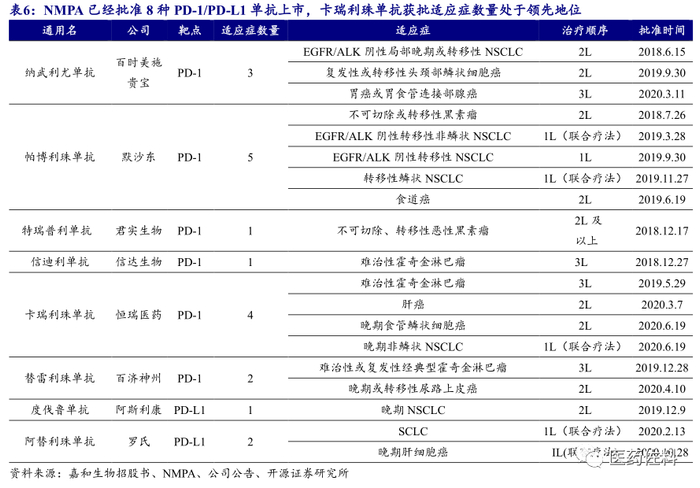 截至目前已经有6种PD-1单抗和2种PD-L1单抗在国内获批上市,其中帕博利珠单抗获批适应症数量最多,为5个,公司的卡瑞利珠单抗获批4个适应症,数量仅次于帕博利珠单抗,是国产PD-1单抗中获批适应症数量最多的产品。