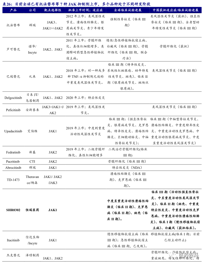 SHR0302是特异性JAK1抑制剂,特异性高,避免了Tofacitinib出现的贫血等不良反应,具有高选择性、高效和延长的血浆半衰期的特点,治疗窗更大,安全性更好。2020年10月公司公告,SHR0302在治疗于中-重度特应性皮炎的临床II期研究终点达到方案预设的有效标准,初步验证了SHR0303的临床疗效。我们认为虽然SHR0320在JAK抑制剂中上市顺序相对靠后,但在JAKI特异性抑制剂的竞争中,进度与竞品接近,在国内上市后将成为JAK抑制剂领域强有力的竞争者。