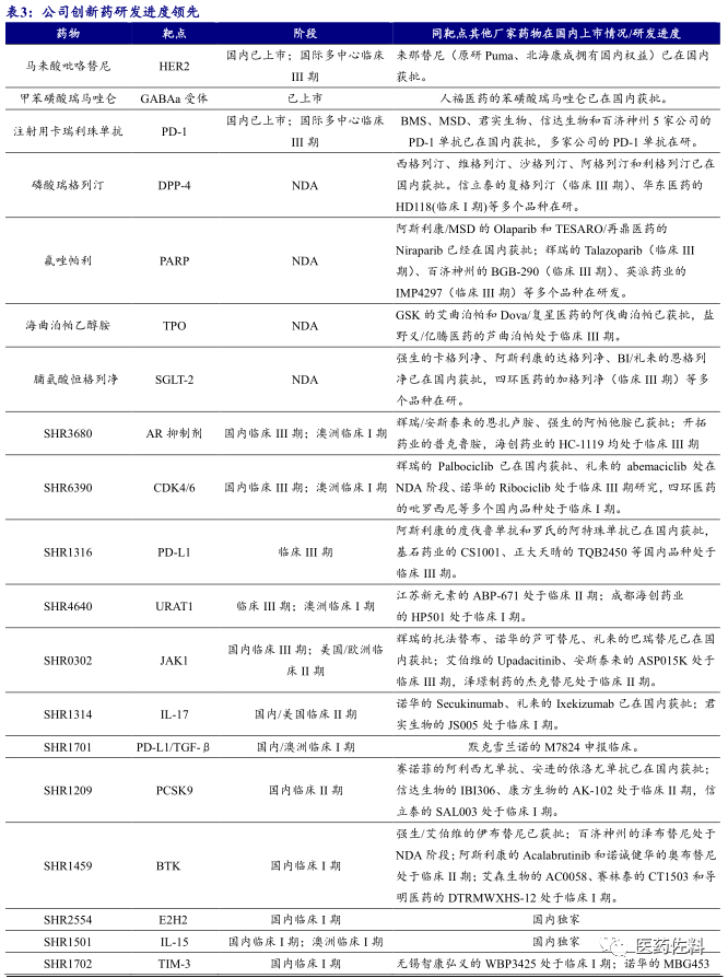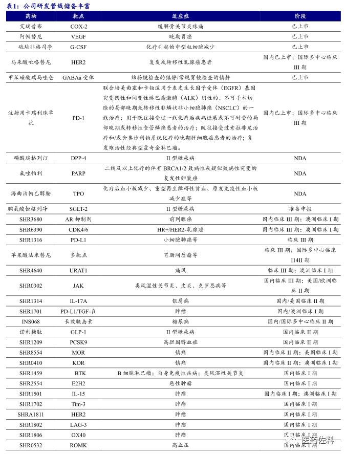 目前公司已有艾瑞昔布、阿帕替尼、硫培非格司亭、马来酸吡咯替尼、甲苯磺酸瑞马唑仑和卡瑞利珠单抗6个创新药上市;瑞格列汀、氟唑帕利、海曲泊帕和恒格列净等申报上市;SHR3680、SHR6390等处于临床III期研究阶段;多个药物处于临床II期和临床I期间。公司研发管线丰富,产品梯队已经成型,基本形成了每年都有创新药申请临床,每 1-2 年都有创新药上市的良性发展态势。