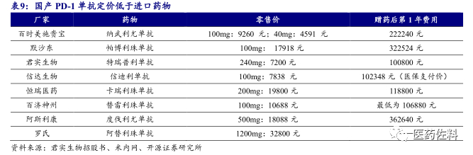 目前国内共有6中PD-1单抗和2种PD-L1单抗上市,从定价来看国产药物的价格普遍低于进口药物。信达生物的信迪利单抗已于2019年11月通过谈判进入医保目录,价格降幅超过 60%,年费用为10.23万元,适应症为至少经过二线系统化疗的复发或难治性经典型霍奇金淋巴瘤的患者。我们认为未来PD-1/L1单抗若纳入医保,医保支付价仍然有下降空间,主要由于:1)不同PD-1/L1单抗适应症有重合,存在一定竞争关系;2)肺癌、肝癌等适应症患者数量远高于经典型霍奇金淋巴瘤,相关适应症若要被纳入医保,预计要接受更低的价格。假设国产PD-1/L1单抗纳入医保后支付价为8万元/年。