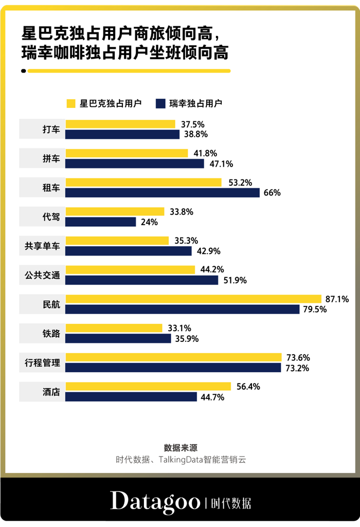 TalkingData分析指出,只喝星巴克的消费者更常使用代驾、民航、行程管理和酒店等类型的App,说明星巴克独占用户可能需要经常性的应酬或出差,表现出较强的商旅属性。