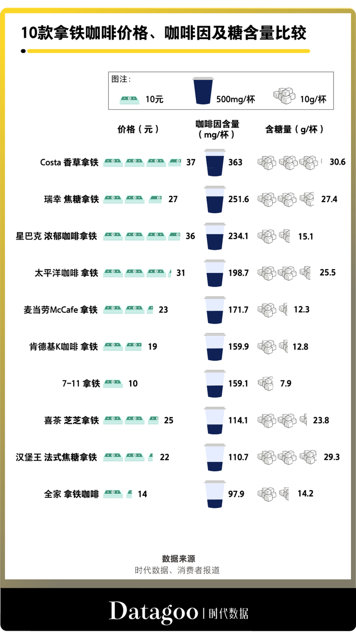 从性价比的角度来看,7-11 的拿铁咖啡最为优质。只要你花 20 块钱买两杯,咖啡因的摄入量就可以比肩一杯 37 块钱的Costa香草拿铁,而糖摄入量仅仅是它的一半。